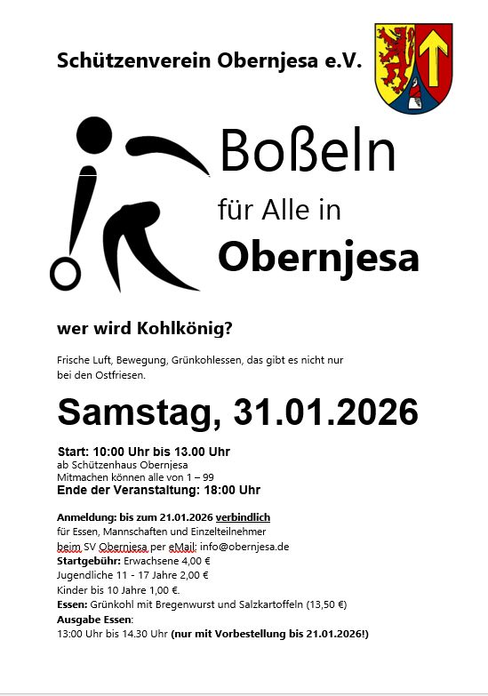Boßeln 2026 20. Januar 202621. Juni 2025 von admin Wann und Wo? Schützenhaus Obernjesa 31. 01. 2026, ab 10:00 Uhr Natürlich gibt es Grünkohl, Bregenwurst und Salzkartoffeln.